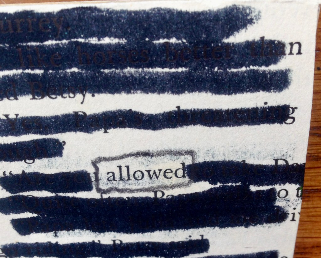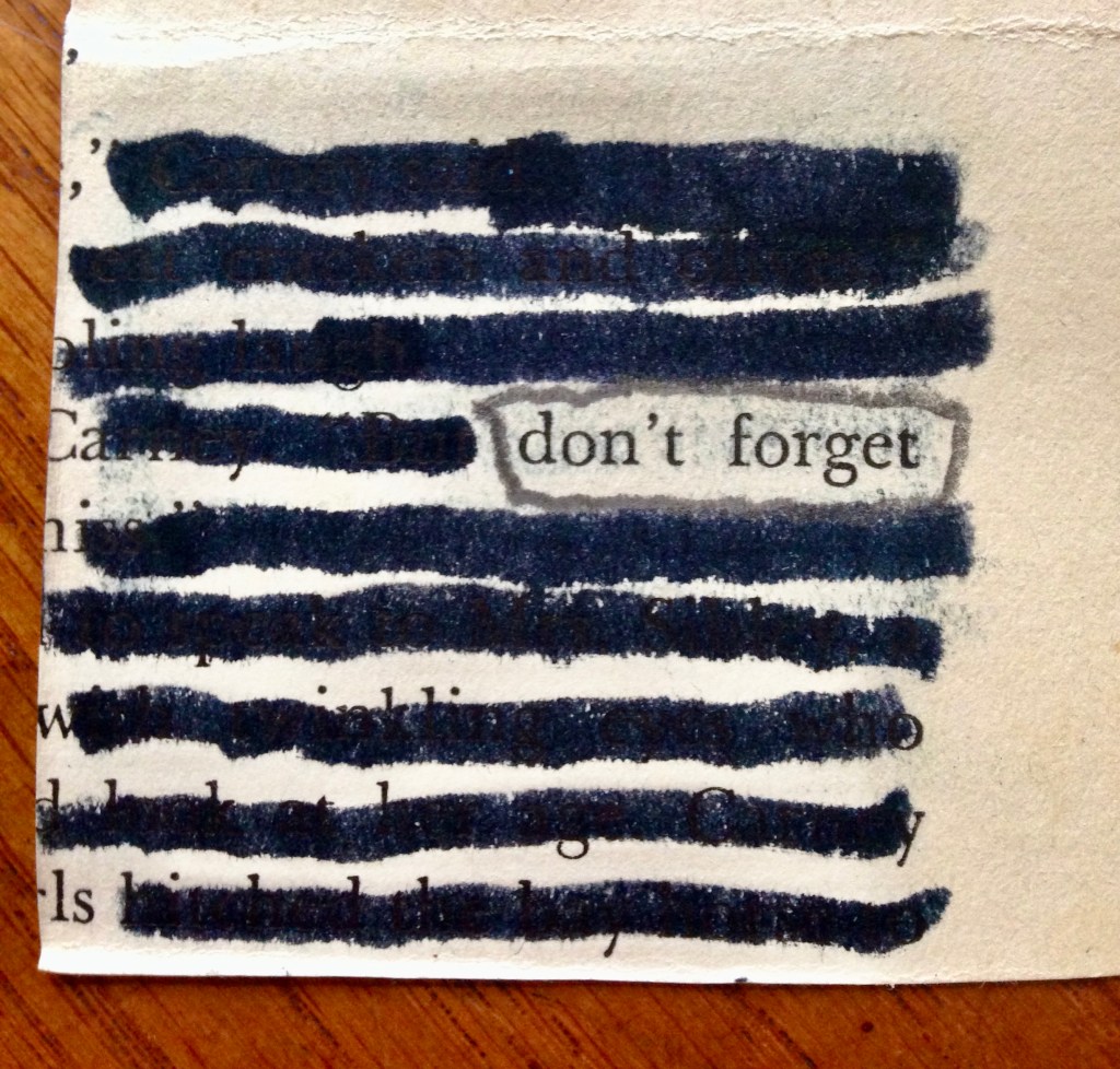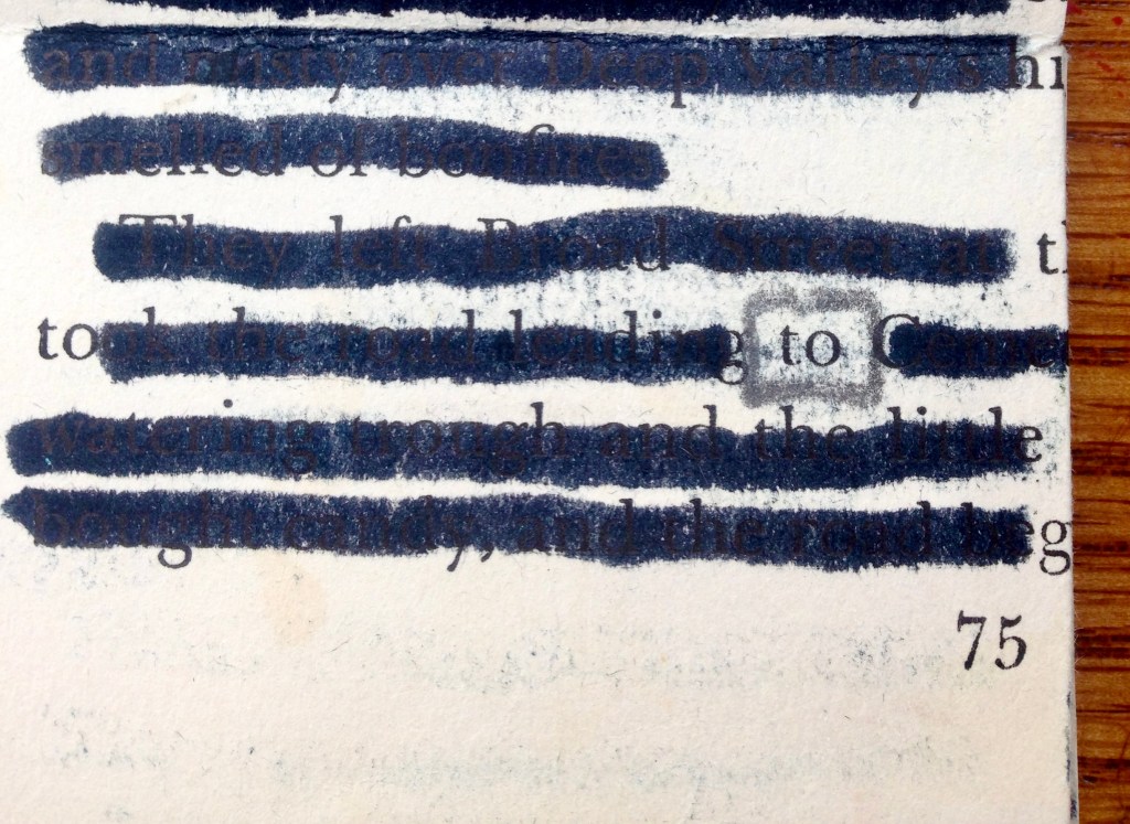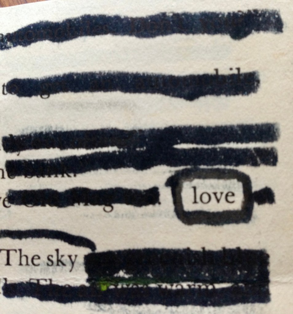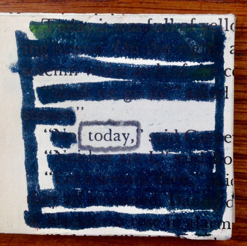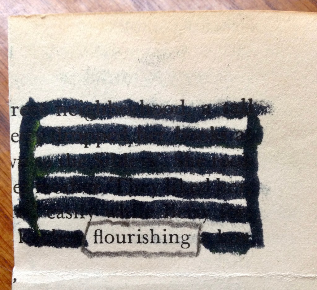 Also on Wednesday, I was to lead our multi-age after school writing club in a lesson on using art in their notebooks. I didn’t feel ready and yet, our session proved to be the most perfect way to spend the late afternoon. Sharing with students lots of ideas for using collage, sketching, creating lists of favorite words, exploring mixed media, and unlocking possible means for expression turned out to be an enormous blessing. The kids — in grades 3-8 — were enthusiastic, diligent, and incredibly creative. When they started working on their own, I decided to create something along with them. I pulled a page from a very old book that had been discarded, and, through a series of folds, I was able to make a tiny volume of my own. Then I blacked out all but one word on each page. The result was astonishing.