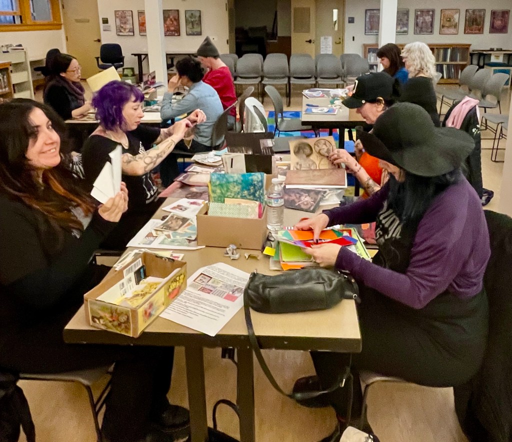 On Sunday I offered a workshop in creative collage making at our local library and got to spend two safe, joyful hours with a dozen women, talking, laughing, and making art together. I told them our plan would be to unplug and unwind, to avoid comparison and self-criticism, to explore images and textures, and to express whatever feelings we might be carrying, whatever stories we’re holding. Some of our attendees were carrying grief or anxiety, some said they don’t really have a creative practice on their own and welcomed the chance to sit together and create narrative with images. Image making is, after all, the way humans first wrote our stories. Releasing the story can free the heart, letting the light in. Sometimes this art making can be an enormous opportunity for healing and to allow in the possibility of delight. Most importantly, it gives us a chance to come home to who we are, who we mean to be, and to breathe a little.